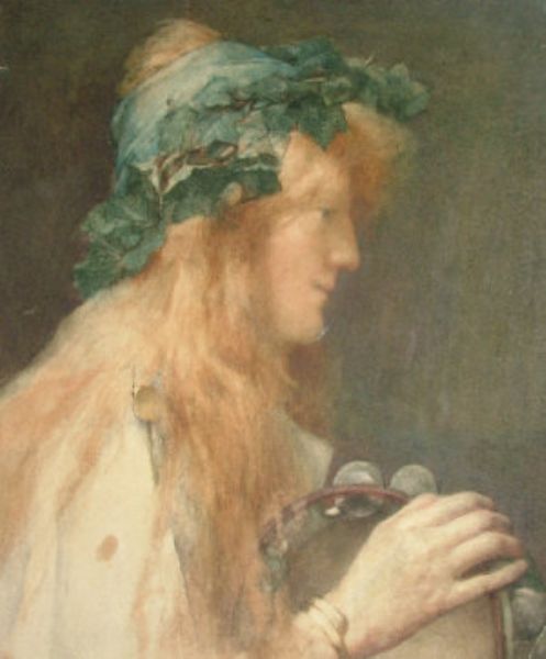 | Portrait of a lady quarter-length turned to the right in profile with an ivy garland in her hair holding a tambourine | |
