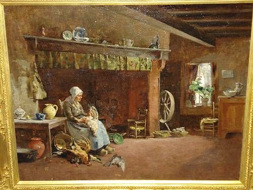 A kitchen scene with a woman seated before a fireplace plucking a chicken