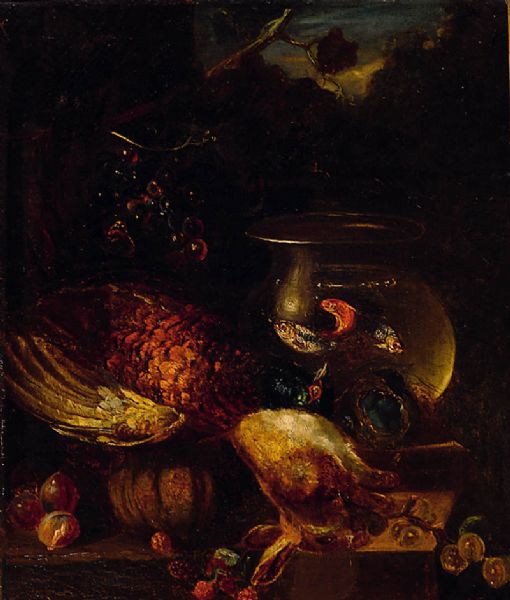 Stilleben mit Fischen im Glas, erlegtem Fasan und Hasen soowie Obst