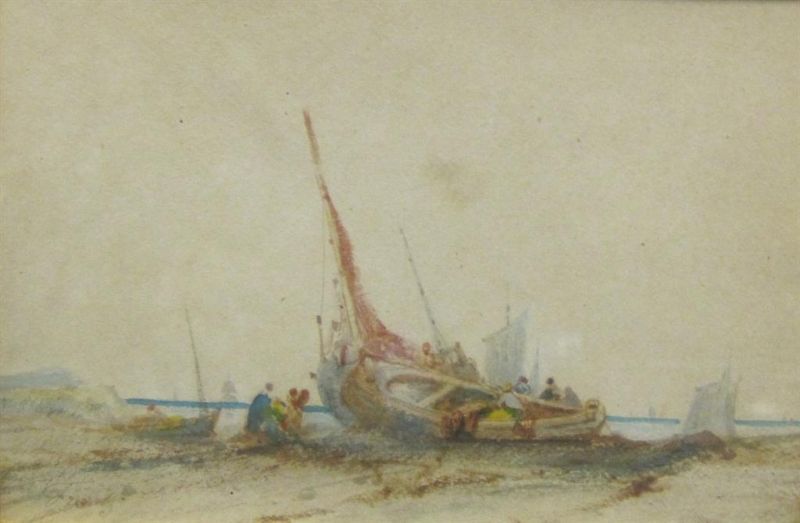 A shore view with fisherfolk by a beached boat at low tide