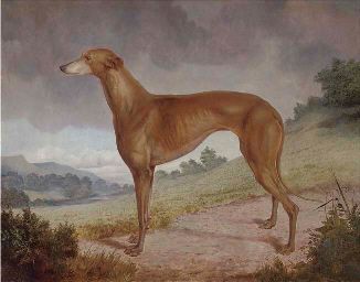 A tan greyhound in an extensive river landscape