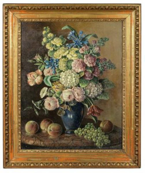 Stilleben mit Blumen in Vase daneben Pfirsiche und Weintrauben