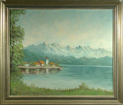 Blick auf die Insel Frauenchiemsee, im Hintergrund die Alpen unter sommerblauem Himmel