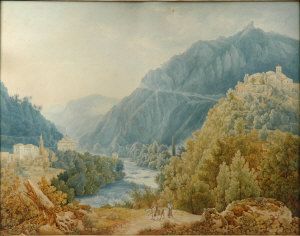 Roma, extensive maountainous landscape with figures approaching a town beside a river