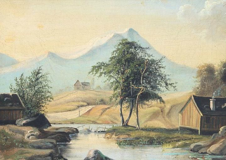 Mountain landscape with cottages by a river.