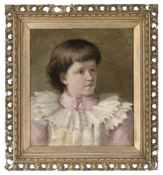 Portrait of a young girl, bust-length, in a pink dress with white ruffs