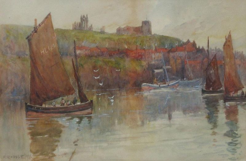 Whitby Harbour with fishing cobles in the foreground, Abbey and Church on the cliffside
