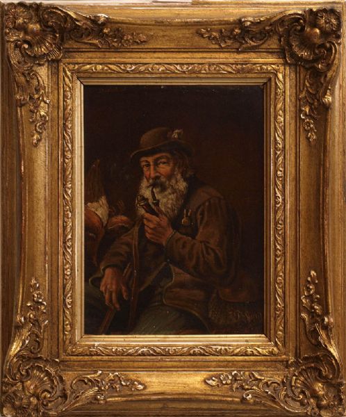Dreiviertelsportrait eines alten Jägers mit umgehängter