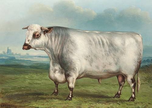 A prize shorthorn bull in a landscape