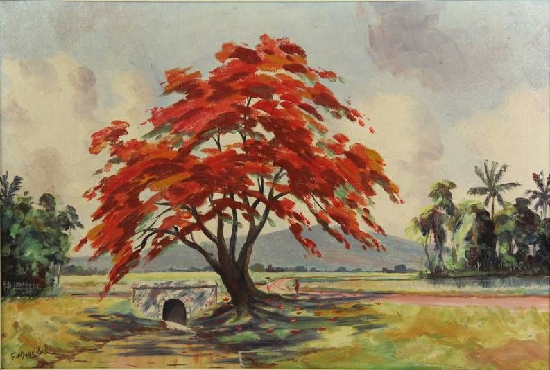 Flamboyan bij Tjé Bautar Haoer Buitenzorg met de Salak op den achtergrond