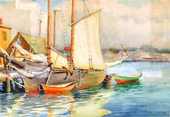 | depicts a sailboat and three dinghys tied up at a New England type harbor dock | |