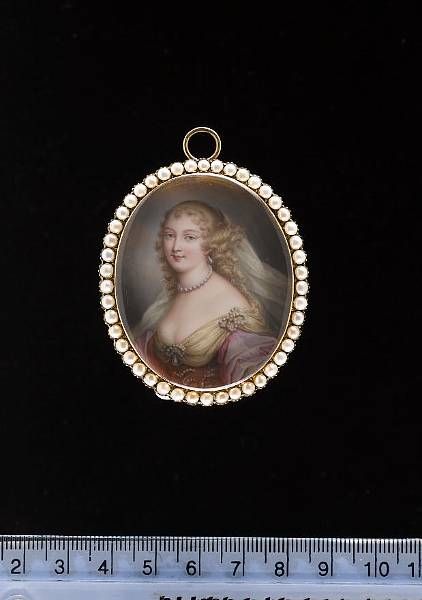 A Lady, wearing pink dress with voluminous sleeves and gold kerchief both with elaborate pearl