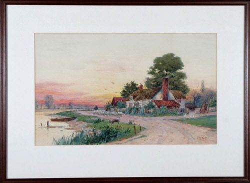 A THATCHED COTTAGE AT SUNSET WITH A SHEPHERD AND FLOCK IN THE FOREGROUND