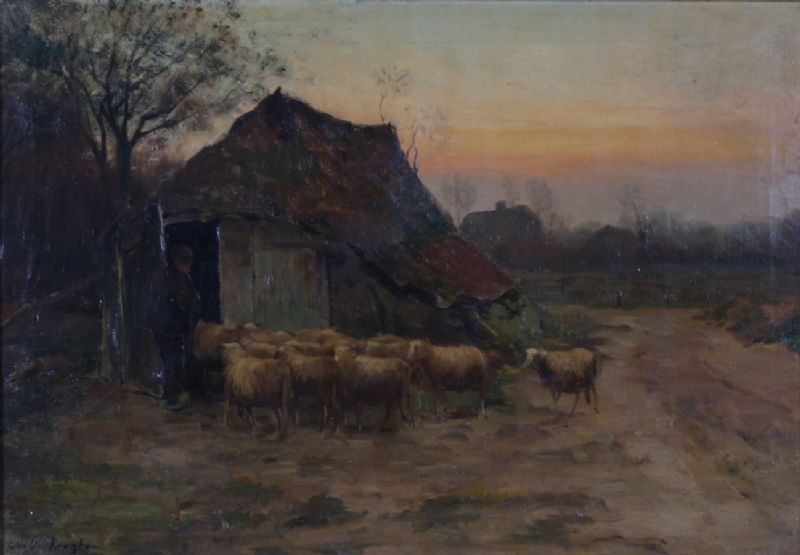 Kudde schapen met herder voor de kooi.