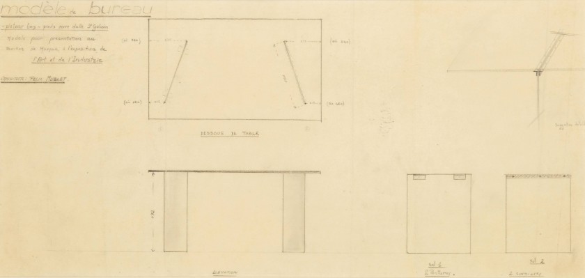 Projet de bureau (vue de profil, de dessus et détail du piètement)
