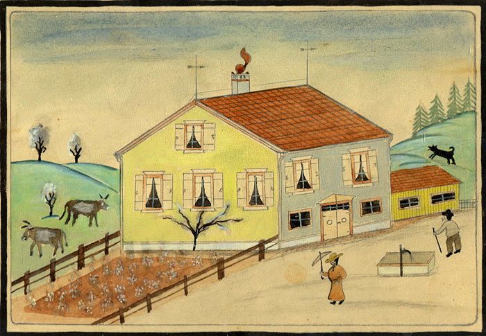Haus mit Vorgarten in Hügellandschaft.