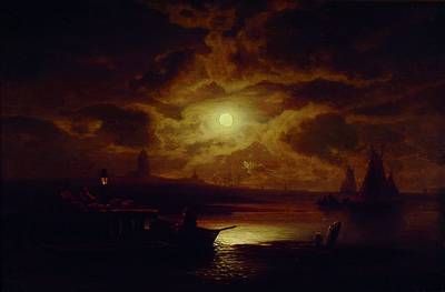 | Fischer beim Vorbereiten der Ausfahrt in mondbeschienener Nacht | |