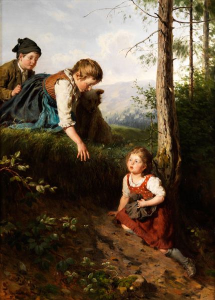 DREI KINDER IM WALD BEIM BEERENPFLÜCKEN