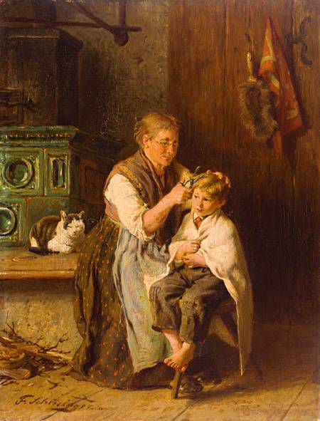 | Mutter schneidet dem Knaben die Haare in malerischer Stube mit Kachelofen und schlafender Katze | |