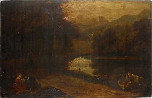 Travellers resting by a path and cattle watering, in a wooded landscape, with a hill town beyond