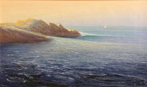 | Rocky shore with sailboat in the distance, believed to be San Francisco coast | |