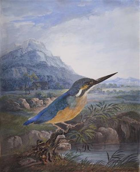 Eisvogel in weiter Landschaft mit Bergmassiv