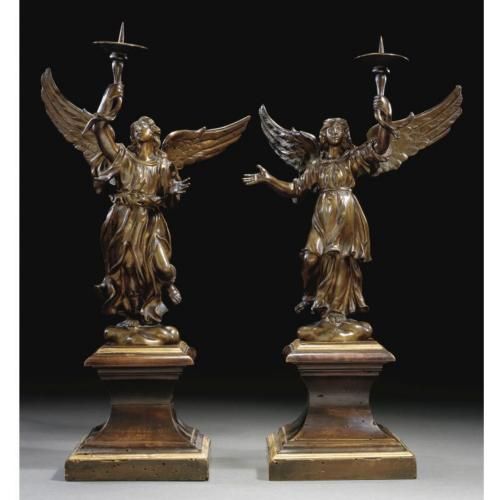 A PAIR OF BRONZE CANDLEBEARING ANGELS