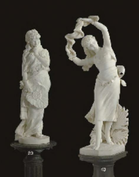 | An Italian white marble figure of a girl with a fan, on pedestal | |