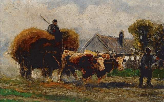 Bauern mit Ochsengespann vor Heuwagen