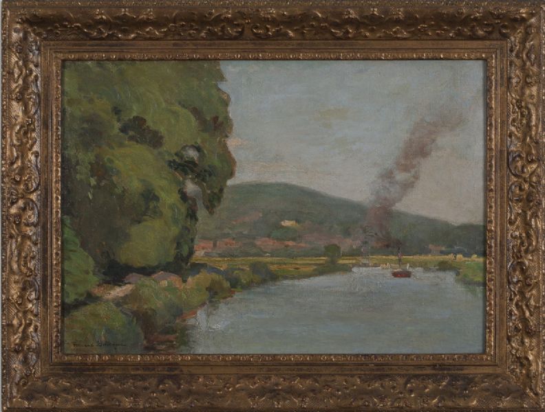 TREES ALONG A RIVER WITH STEAMBOAT