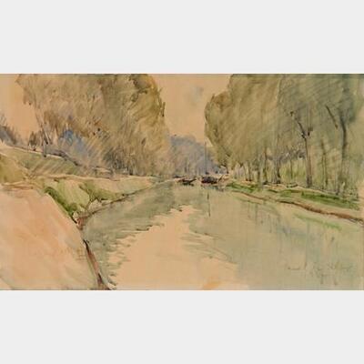Fernand Herbo (French 1905-1995)- ''Canal de Chelles''- watercolor, 1934, signed Herbo lower left, dated and titled, mounted to board (laid down), 3/4'' tear in lower right corner. 10 x 17'' | |