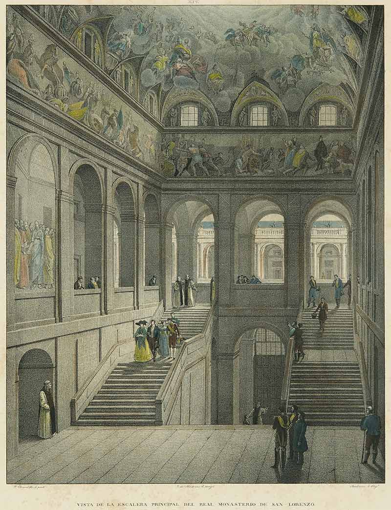 | "Vista de la escalera principal del Real Monasterio de San Lorenzo" y "Vista de la Biblioteca del Real Monasterio de San Lorenzo | |