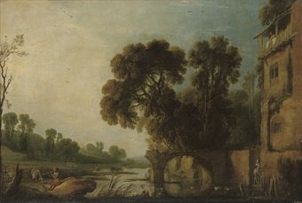 | An Italianate river landscape with a herdsman and cattle watering | |