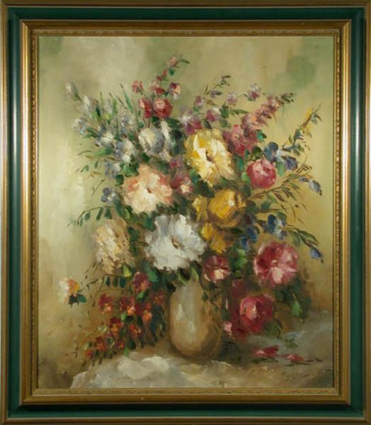 Prächtiger Gartenblumenstrauß in bräunlicher Tonvase auf weißem Tuch vor changierendem Hintergrund