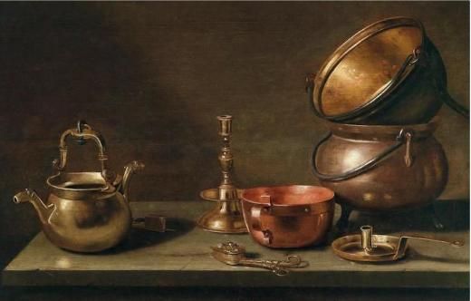| A copper kettle, a candleholder, and a candle snuffer on a table | |