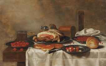 | A ham on a silver plate, a glass of beer, a mustard pot and white grapes on a porcelain plate, cherries, strawberries and red cu | |