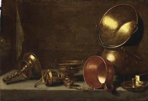 | A STILL LIFE WITH COPPER CANDLESTICKS, POTS AND PANS ON A STONE LEDGE | |