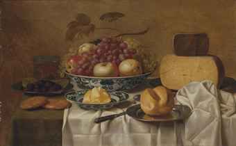 | Pommes, raisins, mures, fromages, beurre et pain dans des plats en porcelaine ou argent sur une table drapée | |