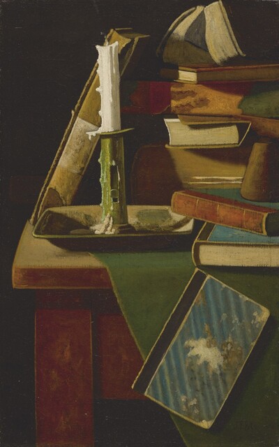 FORGOTTEN FRIENDS: CANDLESTICK AND BOOKS ON TABLE