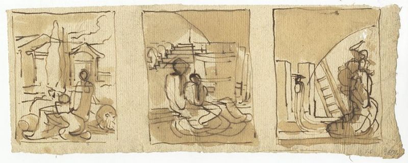 Tre fogli con 4 Studi riquadrati con figure e una Santa in preghiera