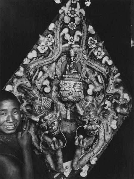 | Un novizio sorregge un'imponente "torma", monastero di Dungkar, Valle di Chumbi, Tibet, aprile [..] | |