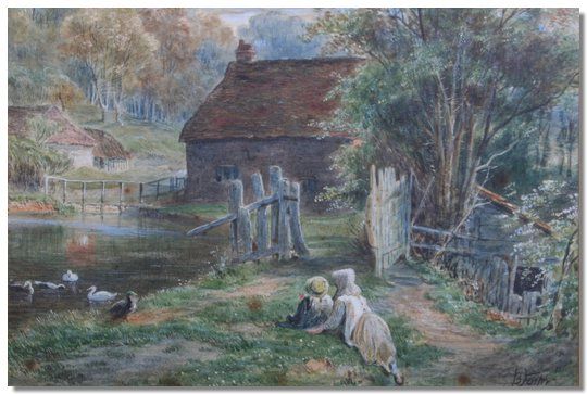Figures watching duck by a pond with cottage and woods beyond