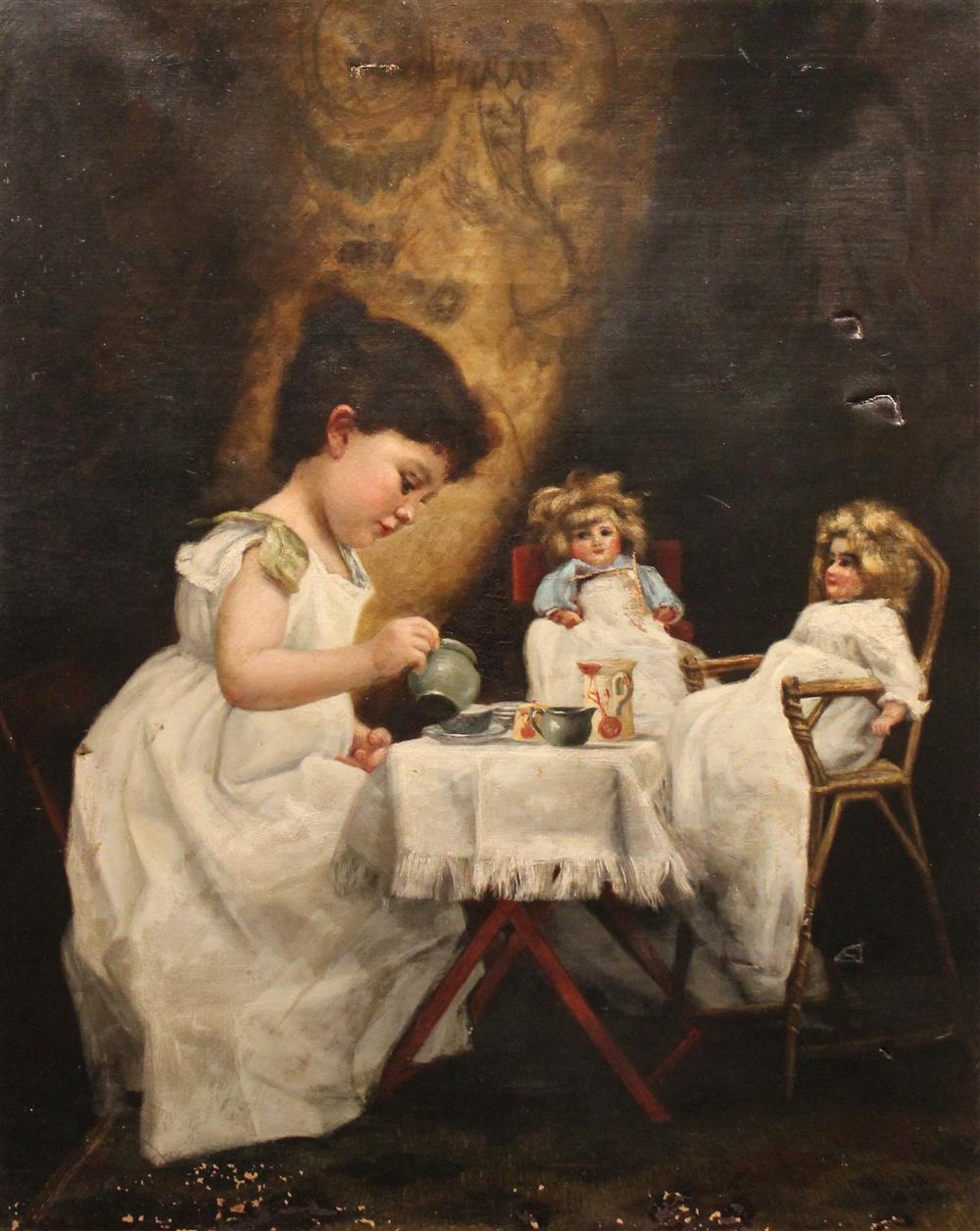 | LITTLE GIRL HAVING TEA TIME WITH HER DOLLS | |