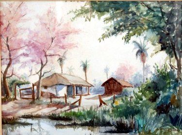 Tropical scene with wooden building bellow flowering trees and palms