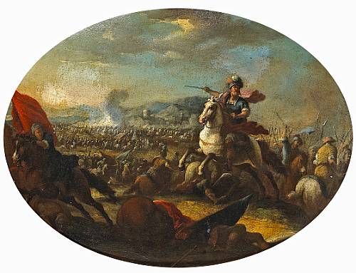 A battle scene with a mounted warrior in the foreground