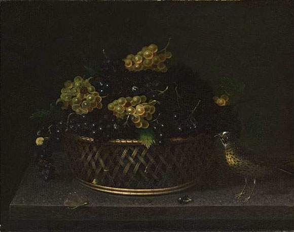 | Grive près d'un panier de raisins avec escargot, mouche et libellule | |