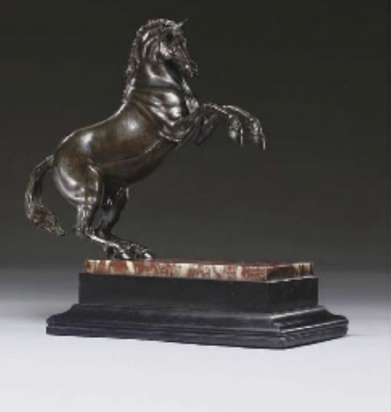 | Sculpture on a rectangular spreading marble plinth; dark brown patina with lighter high points | |