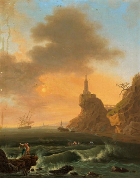 South-Italian coastal landscape with ships and fishermen