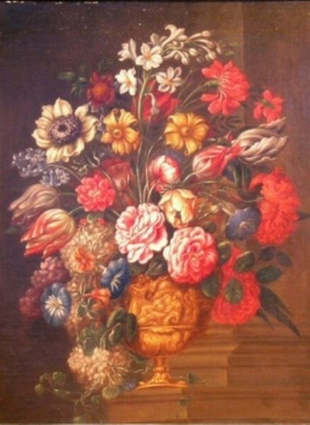 STILL LIFE OF PEONIES, TULIPS, MARGUERITES AND OTHER SUMMER FLOWERS IN A SCULPTED VASE ON A LEDGE