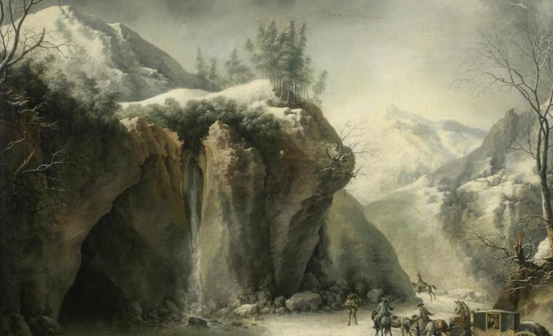 A rocky winter landscape with elegant figures in a horse-drawn carriage